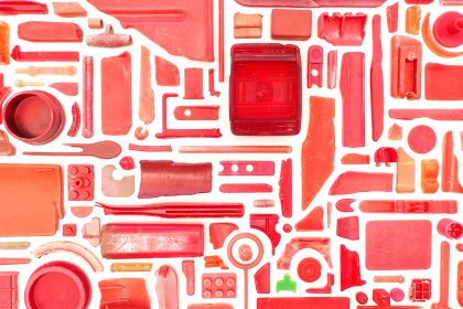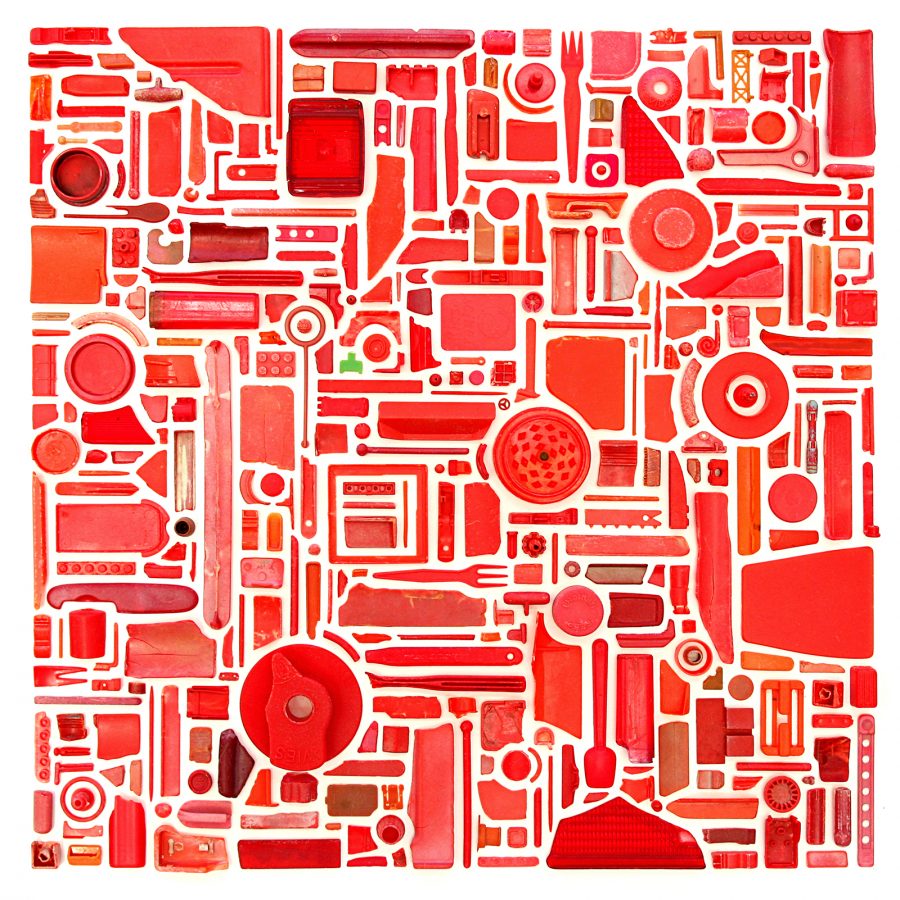 Absent Histories – Combination Piece (Red No2). 2017. Unaltered Marine plastic objects found on the UK coast, 1994-2017 on card. Dimensions approx 60x60x5cm.