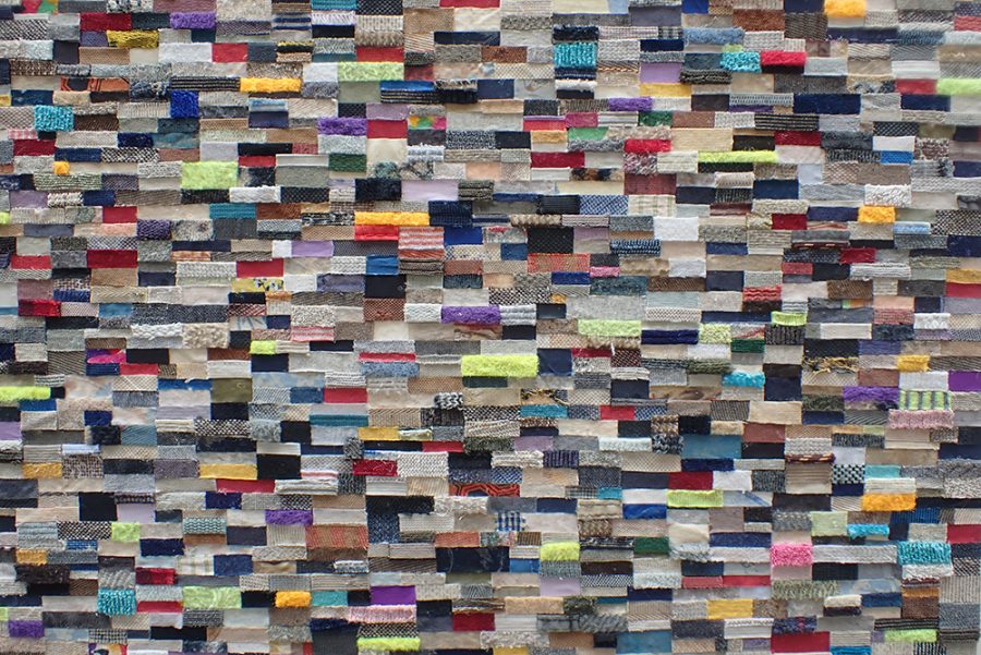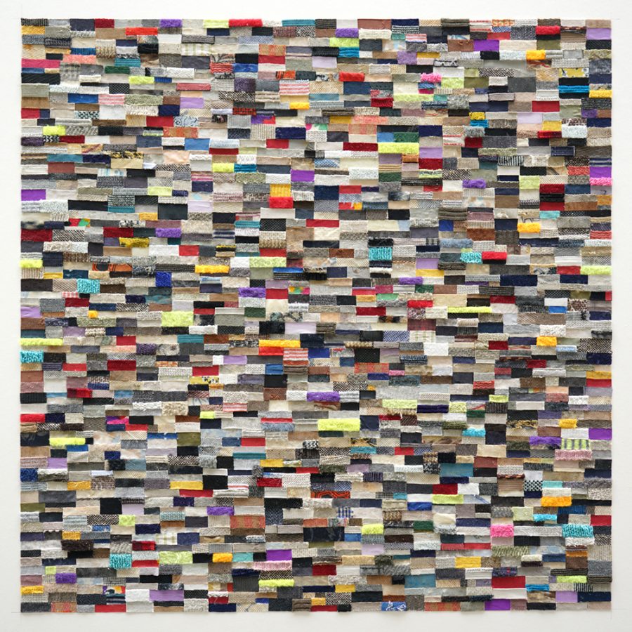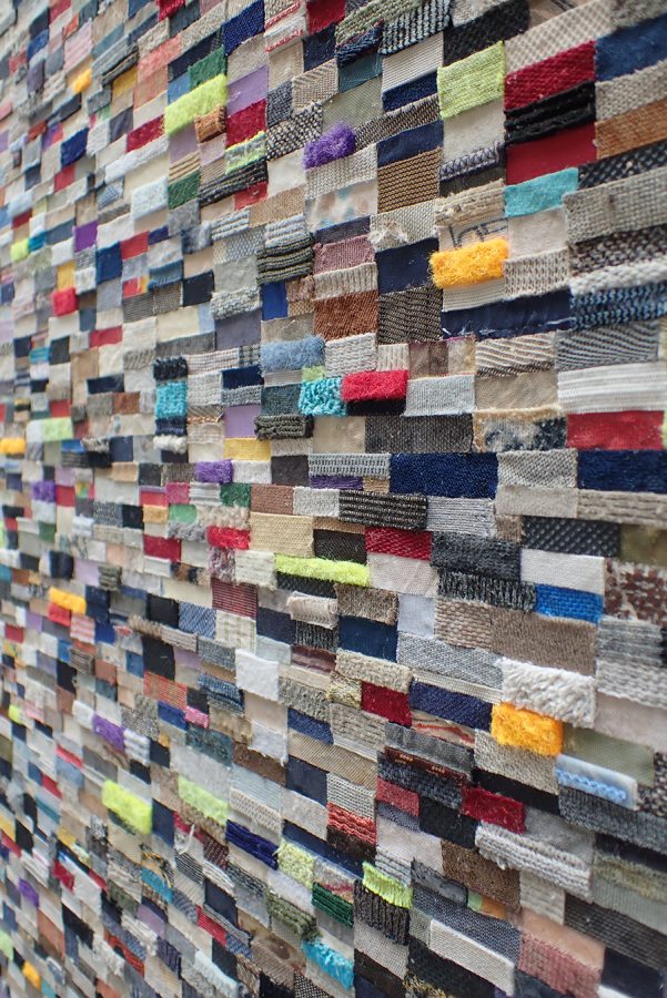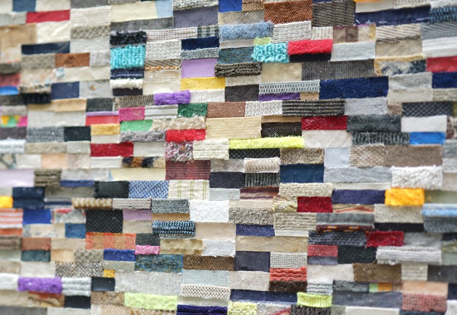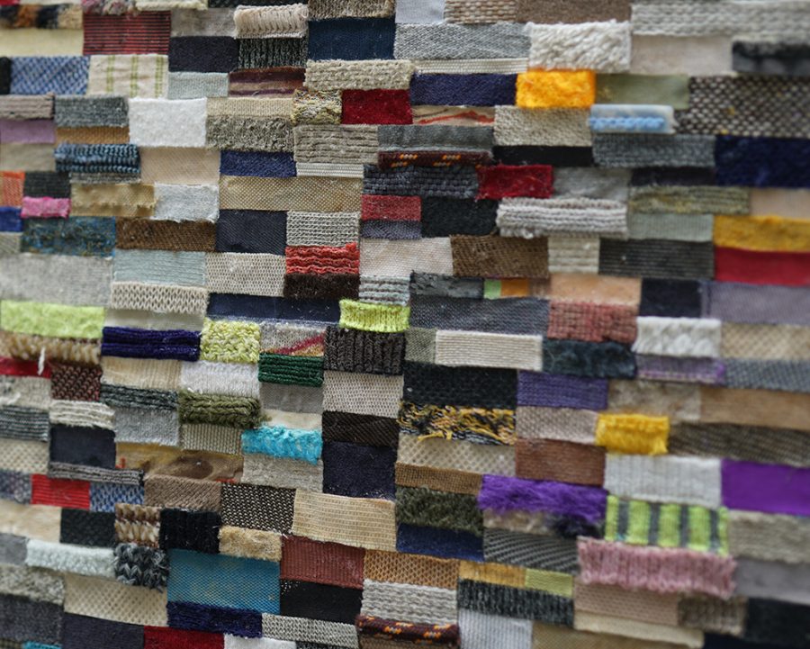 Textiles/fabrics pieces found on the UK coast, 2019-2022. On archival board. Dimensions (approx.): 4cm x 60cm x 60cm White wood box frame.