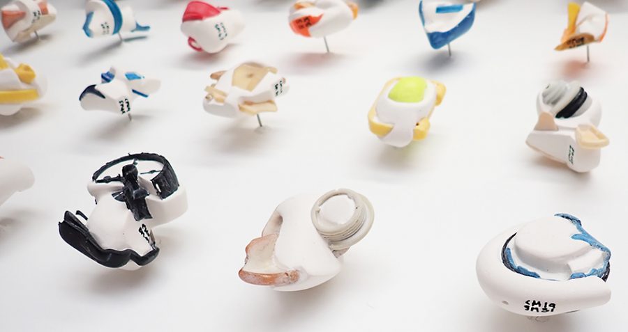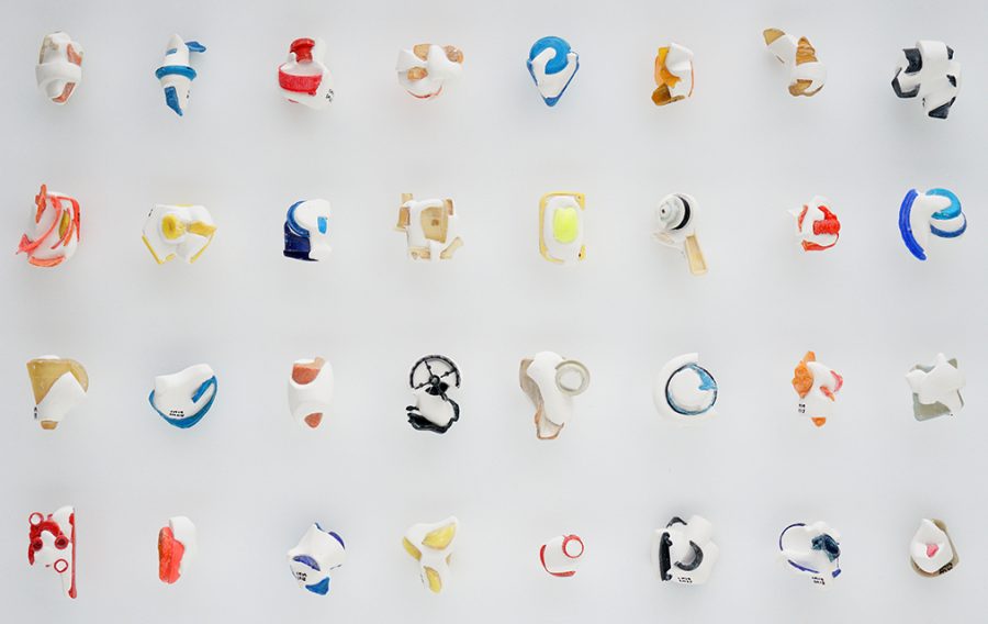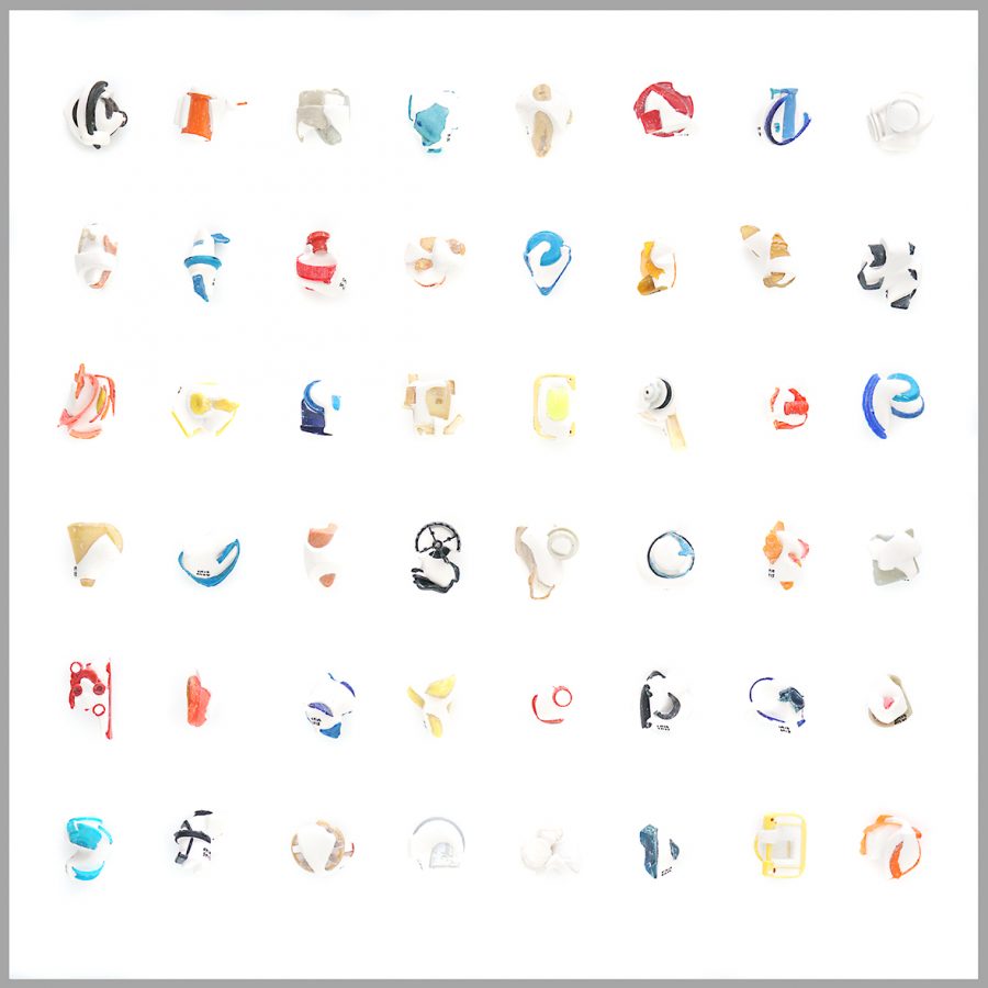 48 individual sculptures assembled from unaltered marine plastic objects, found on the UK coast, 1994-2019 and Herculite 2 Plaster.