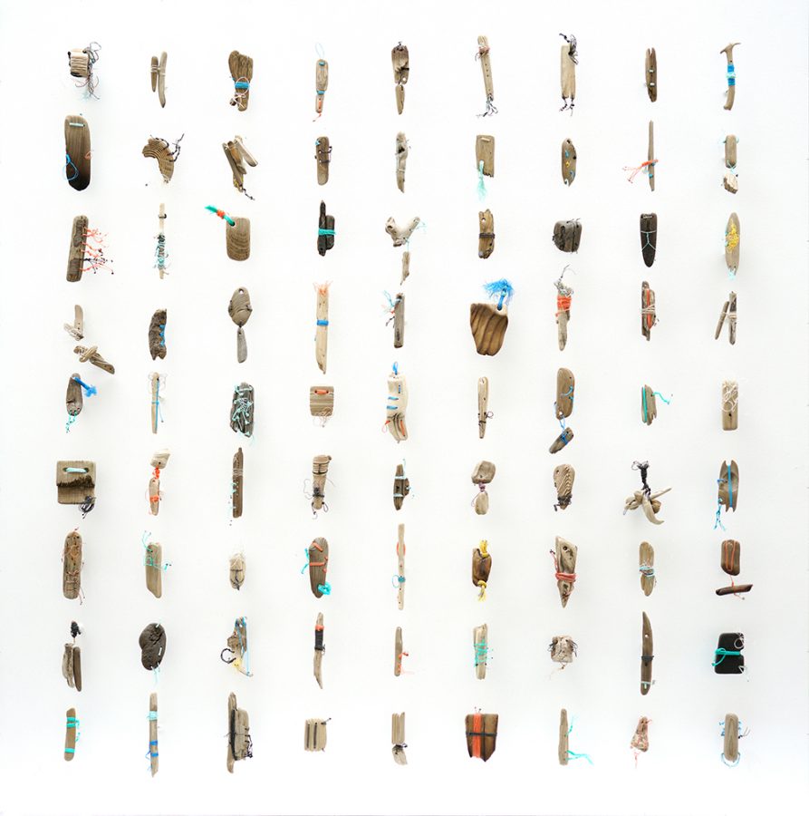 81 individual sculptures assembled from monofilaments, rope filament, marine plastic, and wood all found on the UK coast, 1994-2021.