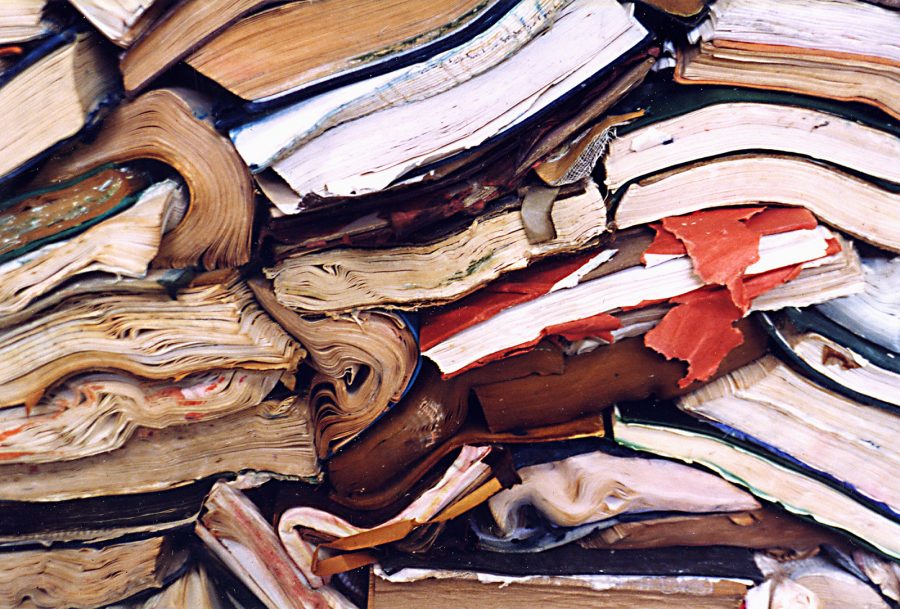 A wrecked and salvaged library, the Sea soaked and water logged bloated books slowly bloom and rot. within them a decaying of dreams and ideas, and a birth of new sprung from the old.