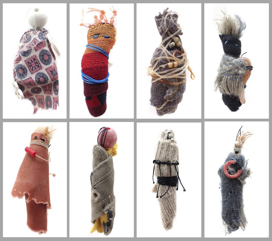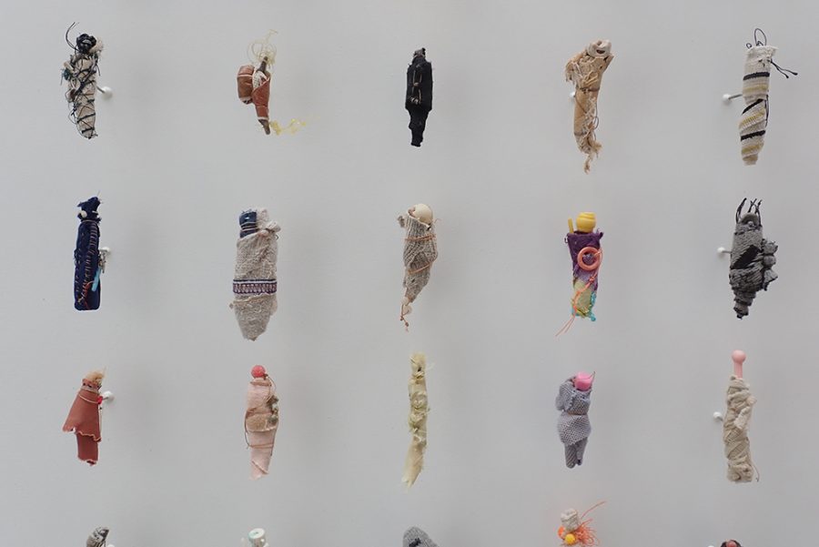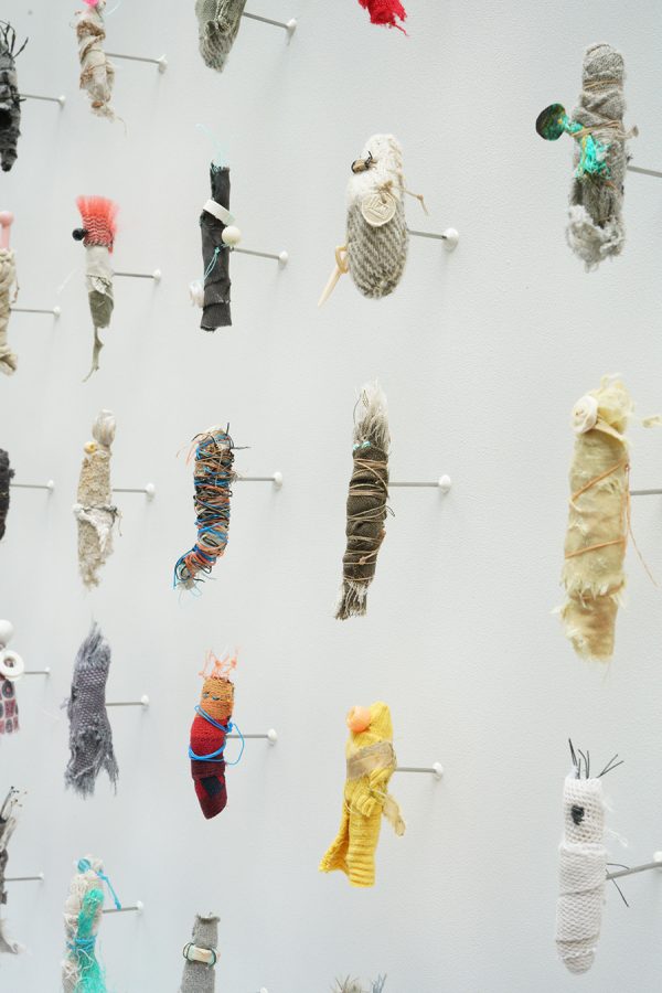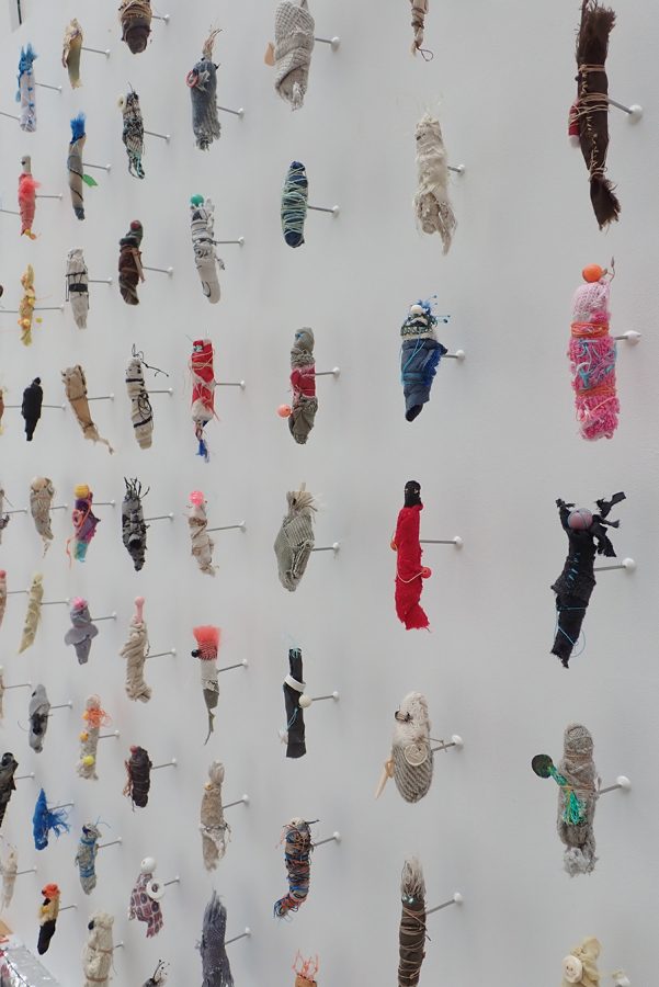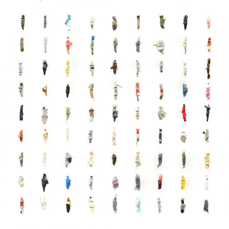 81 individual sculptures assembled from fabric, monofilaments, rope filament, and plastic objects, all found on the UK coast, 1994-2020.