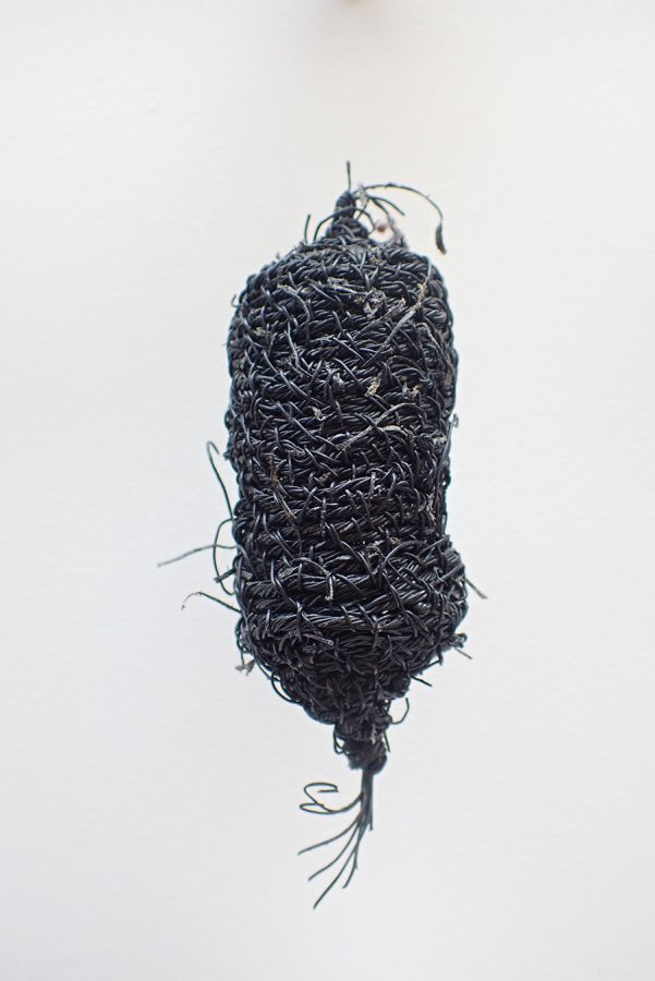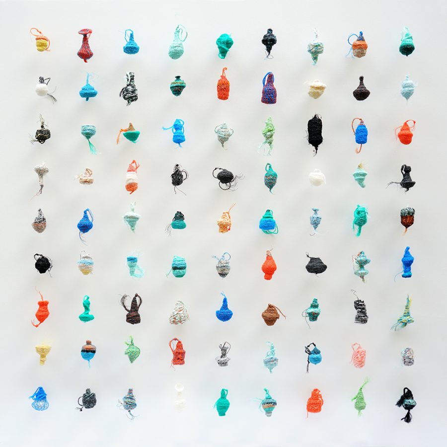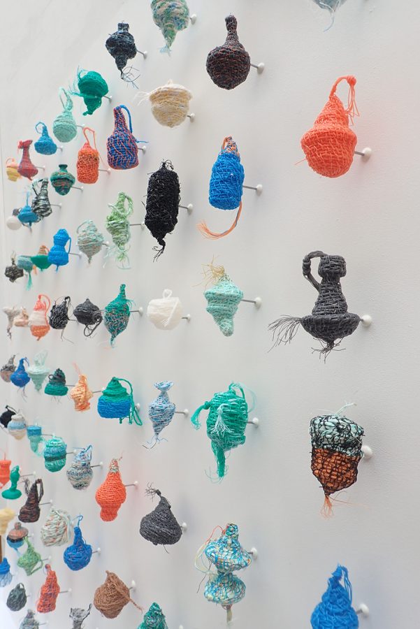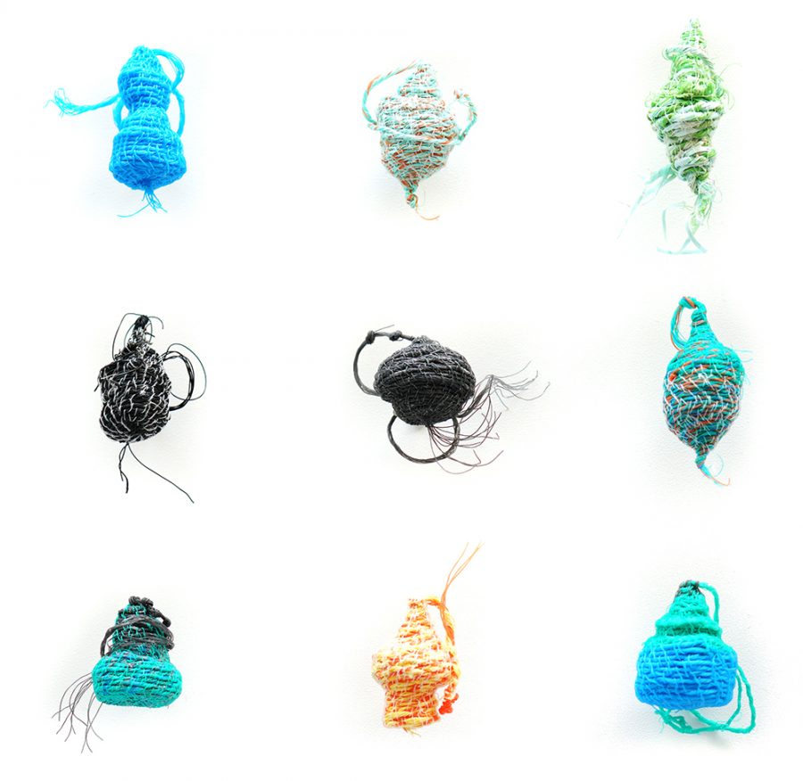 81 individual sculptures assembled from plastic monofilaments, rope filaments, and netting all found on the UK coast, 1994 – 2020.