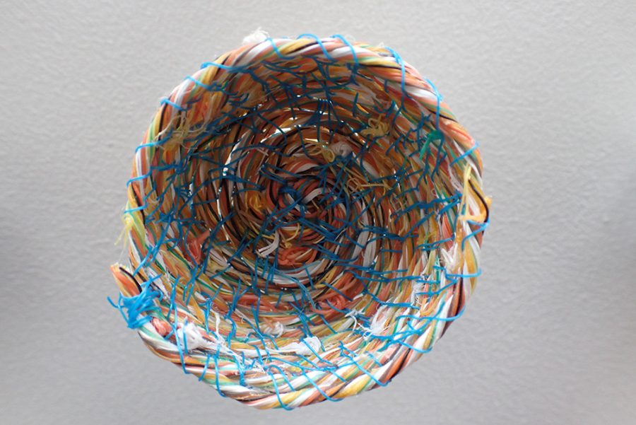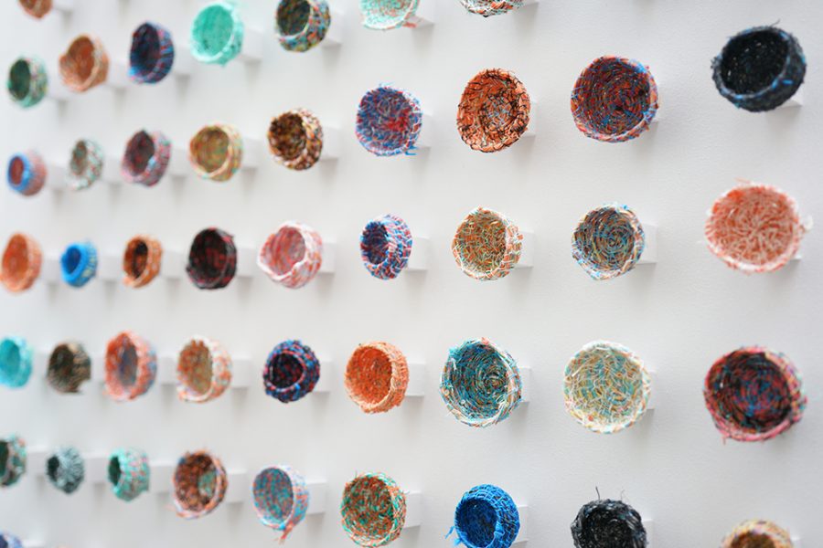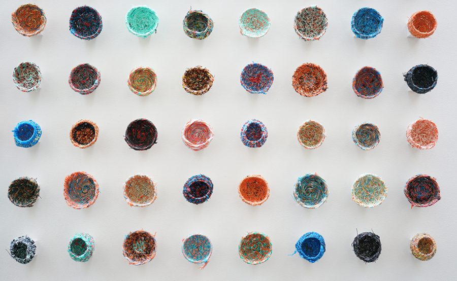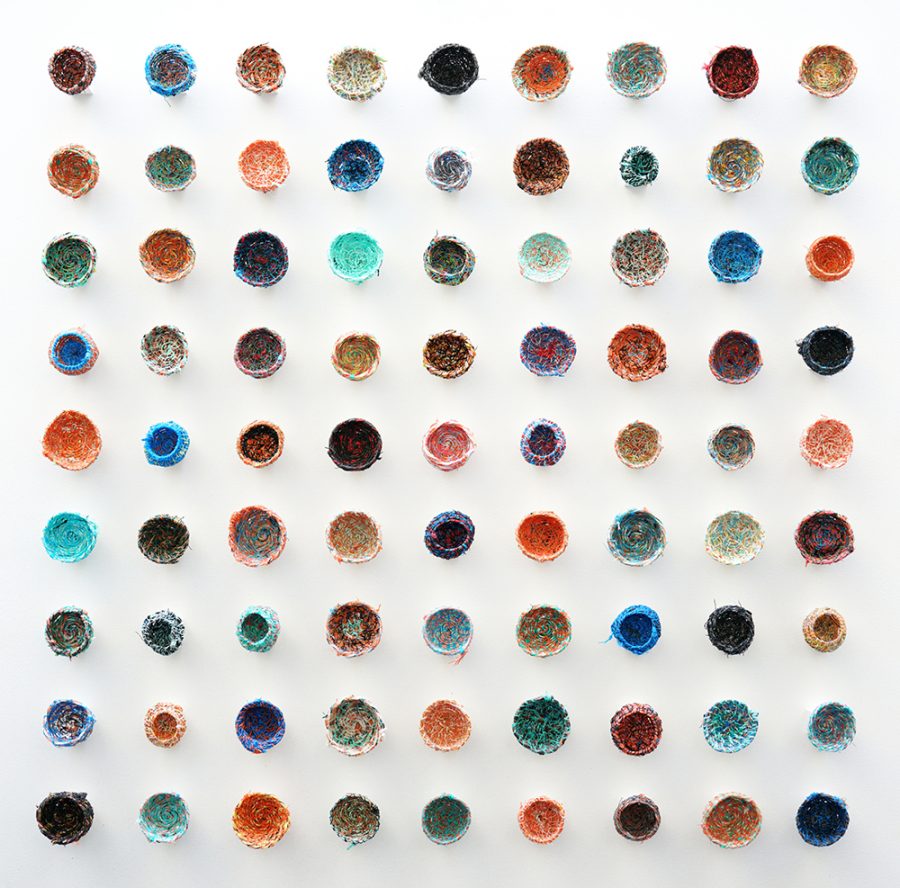 81 individual sculptures assembled from plastic monofilaments, rope filaments, and netting all found on the UK coast, 1994-2024.
