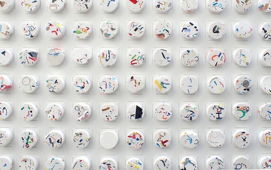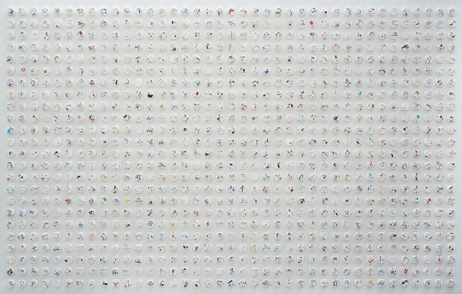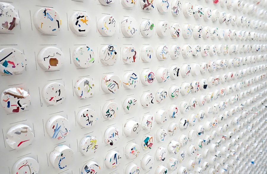 936 individual sculptures assembled from marine plastic objects, and monofilaments all found on the UK coast, 1994-2021. and Herculite 2 Plaster.