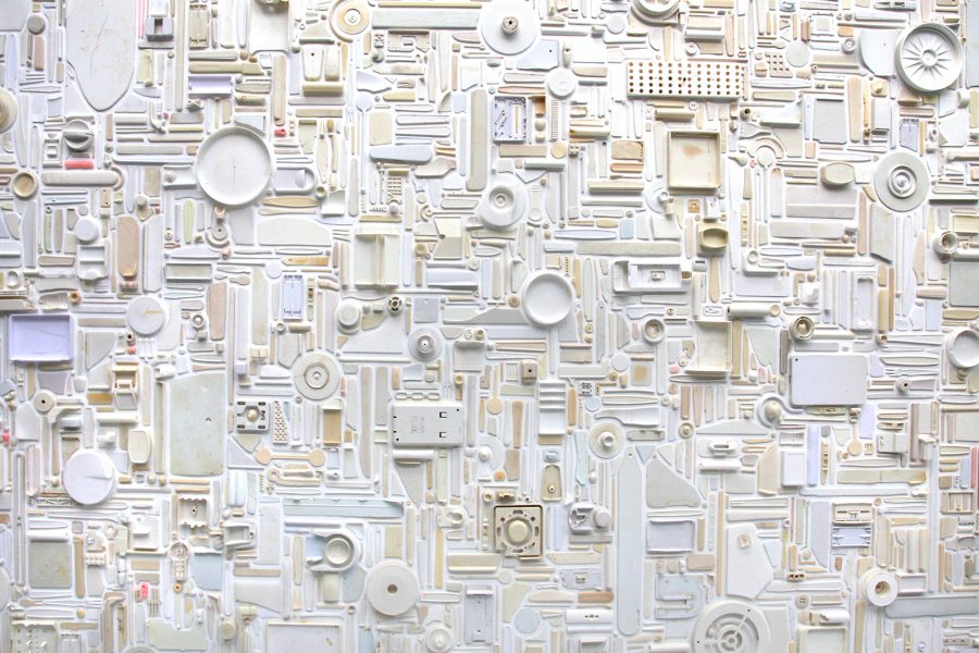 Combination Piece – Cream (Including unnameable somethings). 2017. Unaltered marine plastic objects found on the UK coast, 1994-2017 on gessoed aluminium cradled panel. White Box frame. Dimensions approx 120x180x10cm.